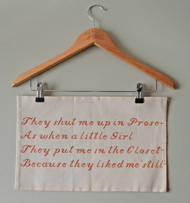 By taking a piece of fabric and imposing a word on it, I have achieved a sense of equilibrium and calm and a feeling of belonging in an otherwise alienating world. Sewing helps me find self-containment and autonomy within a difficult, often lonely, challenging life. It is a form of meditation and a means of slowing down and savouring the beauty and value of each word sewn.